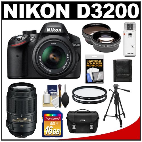 | Nikon D3200 Digital SLR Camera & 18-55mm G VR DX AF-S Zoom Lens (Black) + 55-300mm VR Lens + 16GB Card + Case + Filters + Tripod + Telephoto & Wide-Angle Lens Kit |
