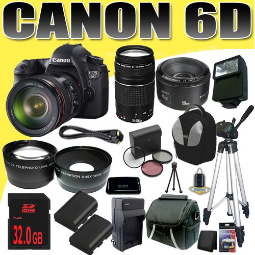 Canon EOS 6D 20.2 MP Full-Frame CMOS Digital SLR with 24-105mm f/4.0L IS USM AF Lens and Canon EF 75-300mm f/4-5.6 III Telephoto Zoom Lens and Canon EF 50mm f/1.8 II SLR Lens TWO LP-E6 Replacement Lithium Ion Battery w/ External Rapid Charger 32GB SDHC Class 10 Memory Card Wide Angle / Telephoto Lenses Filter Kit Full Size Tripod External Slave Flash Deluxe SLR Carrying Case Mini HDMI Cable Deluxe Starter Kit DavisMAX Bundle Details :